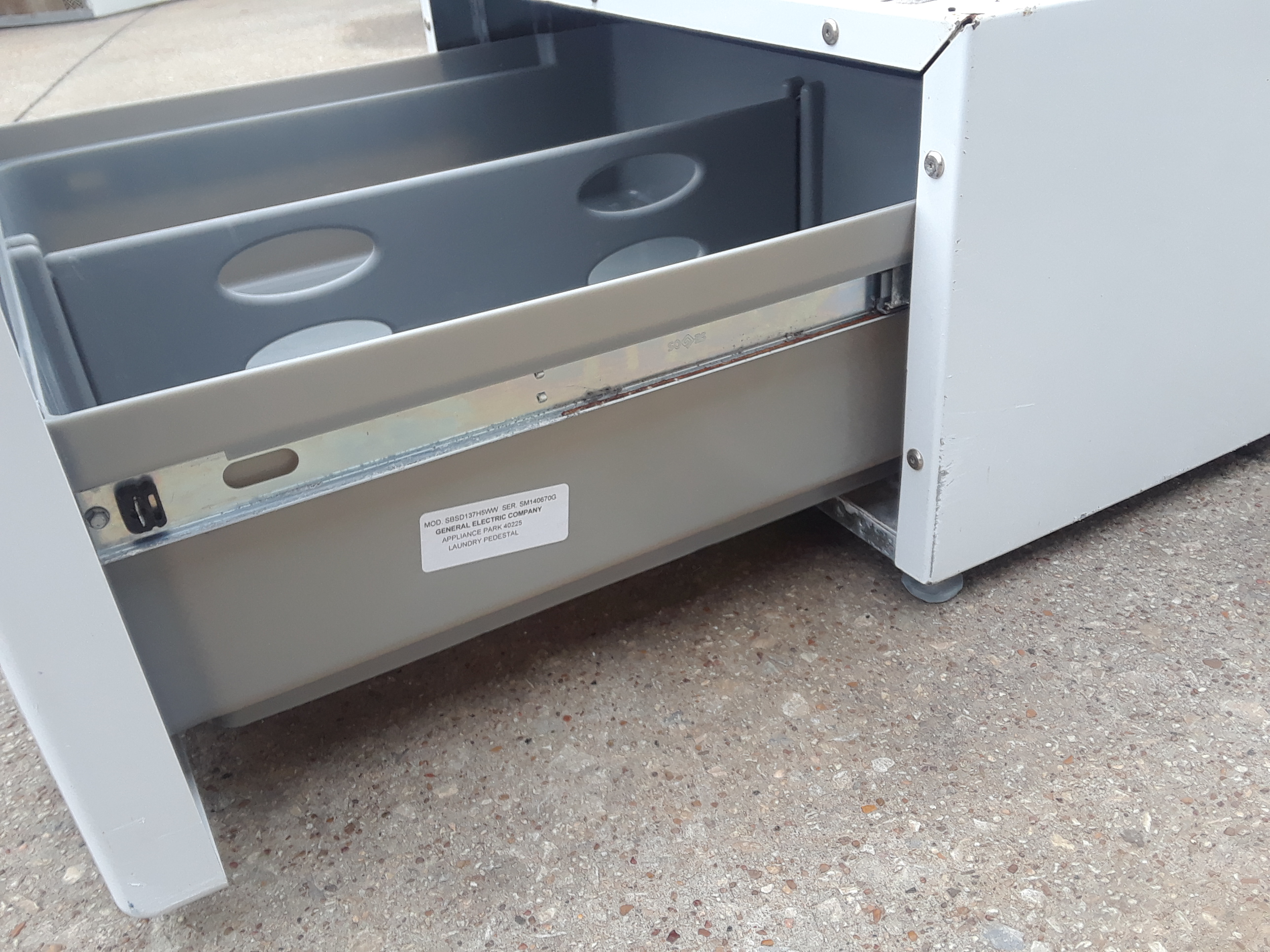 13 inch ge storage drawer for frontload washers and dryers. Pedestal model sbsd137h5ww. Width 27, length 29, height 13. Noticeable scratches and scuff marks. I have more than 1. washerdrawer, dryerpedestal, laundrypededtal